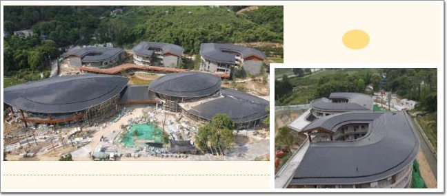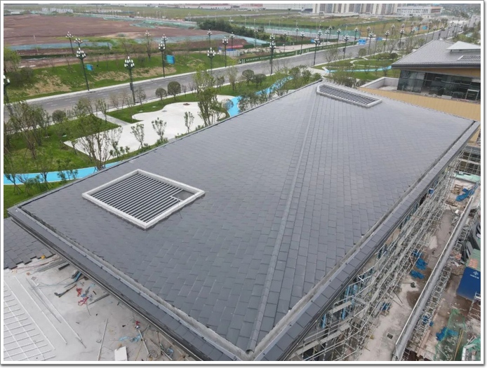 項目位于蒲江縣西來鎮“一館一基地”核心功能區,滿足開展公園城市教育實踐、會展會議、游學研學等功能需求。建筑設計提取臨溪河畔的“古榕新芽”作為概念原型,因樹賦形,依山起伏,同時汲取川西傳統民居精華,以現代建筑設計語言演繹蒲江西來在地文化。結合建筑雙曲造型屋面,采用了模塊化裝配式碲化鎘發電巖瓦菱形系列,不僅給予建筑魚鱗般的絲滑曲線和獨特的皮膚紋理,還能為建筑帶來近8萬kWh/年的清潔電力能源,這是碲化鎘發電玻璃首次以菱形巖瓦的形式應用于雙曲造型屋面,豐富了碲化鎘發電玻璃與建筑結合的形式。