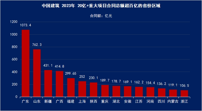 可以看出,境內市場作為中國建筑的主要經營陣地,還是取得了不小的突破。近年來,中國建筑堅持踐行“兩個基礎”“六個力量”,將基礎設施業務作為“轉方式、調結構、促轉型”的重要部分,積極踐行國家重大區域發展戰略,完整準確全面貫徹新發展理念,服務構建新發展格局,推動企業高質量發展。 從所獲大項目按照所屬的省份區域來看,全國29個省份均有大項目落地,其中項目簽約總額超過100億元的區域省份有15 個,排名依次為:廣東、山東、新疆、廣西、福建、上海、陜西、重慶、湖北、安徽、江蘇、河南、四川、內蒙古、浙江。廣東省以1073 億元的簽約總額排名地區榜首位,持續領跑其它省份,可見該區域是中建集團的重點經營區域市場。