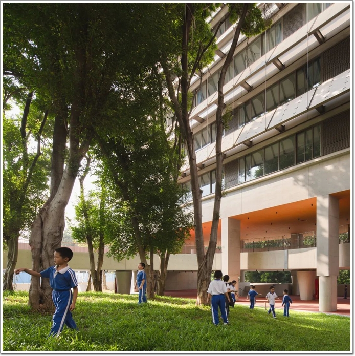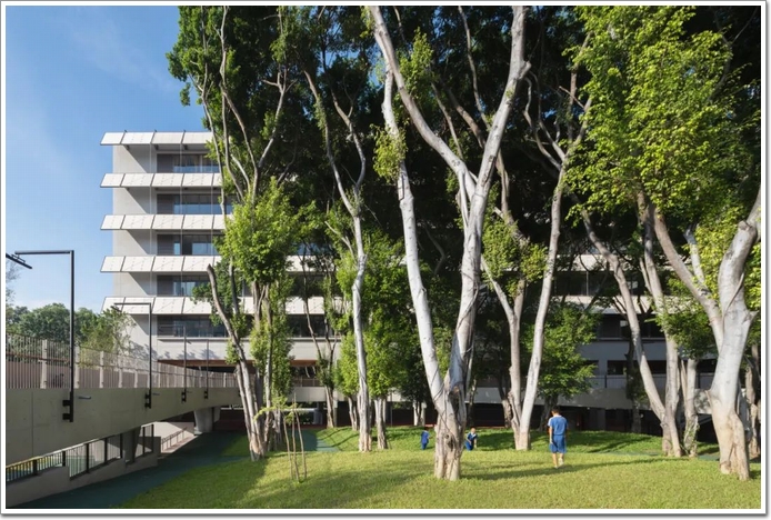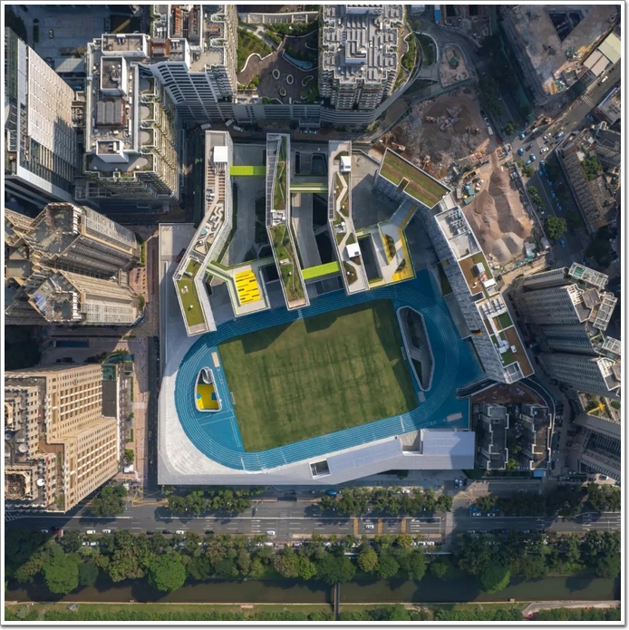 荔園外國語小學(xué)景田校區(qū)選址于于深圳市中心福田區(qū)核心地帶,周圍樓宇密布,場地上原有一片茂密的樹林。項(xiàng)目水平向設(shè)置的公共平臺(tái)、跑道、連廊與垂直向分布的體育、交通空間系統(tǒng)并置、連接,構(gòu)成一個(gè)完整的立體校園活動(dòng)空間系統(tǒng)。