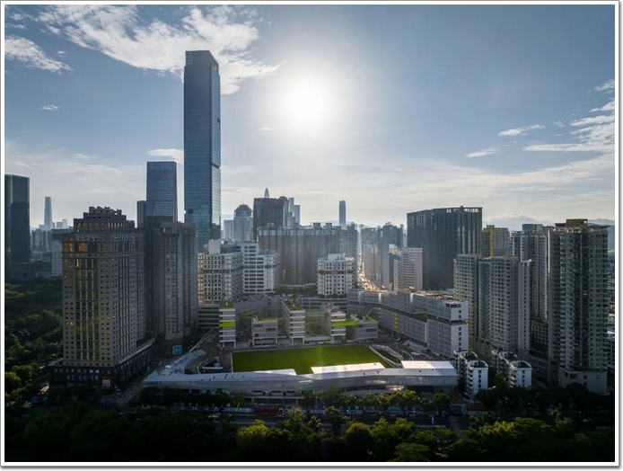 福田中學(xué)是深圳特區(qū)內(nèi)規(guī)模最大的高級(jí)中學(xué)之一,是深圳首批新校園計(jì)劃“8+1”里的“高密度之王”,同時(shí)也是最受關(guān)注、最新建成的學(xué)校。 基地北、東、南三面高層緊貼環(huán)繞,處于一個(gè)非常復(fù)雜而高密度的城市環(huán)境。考慮到已有城市肌理東高西低的天際線,設(shè)計(jì)維持了田徑場靠西布置的格局,將主要建筑體量沿東側(cè)布置,避免對(duì)西側(cè)城市公園界面形成壓迫。