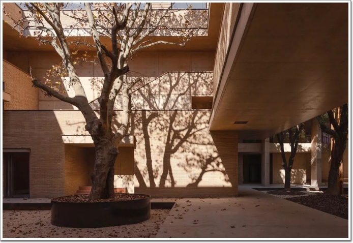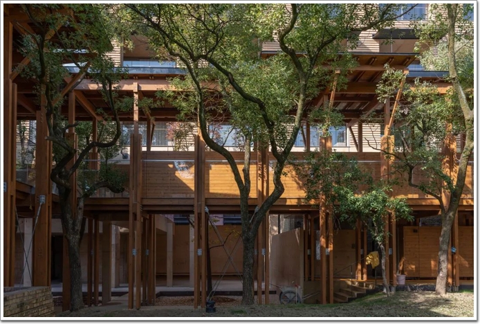 在有限的用地范圍中,將入口曲廊、餐飲、會(huì)議、畫廊、客房等功能分布在木回廊四周,通過廊道與其相連。西側(cè)尺度較小的合院圍繞一棵老梧桐產(chǎn)生對(duì)話,與回廊共同形成空間格局中最重要的兩個(gè)院落。新、老建筑分別采用了與當(dāng)?shù)馗G磚尺寸相同的陶磚與老紅磚作為外墻材料,結(jié)合暖色混凝土營造出新與舊的和諧共生。