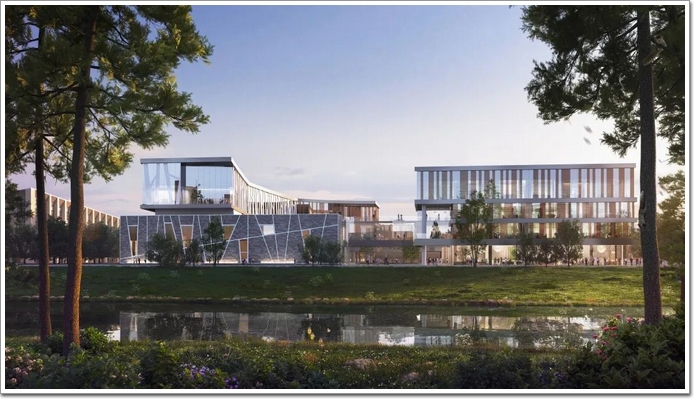 因此設(shè)計(jì)以灣區(qū)環(huán)境和教育模式為出發(fā)點(diǎn),充分利用土地優(yōu)勢(shì),形成“一核一帶多組團(tuán)”規(guī)劃布局,核心建筑對(duì)角向兩側(cè)緩緩收縮和升起,不對(duì)稱的起伏形態(tài)如同大海中的朵朵浪花,營造一個(gè)與海洋共融共生的學(xué)習(xí)社區(qū)。