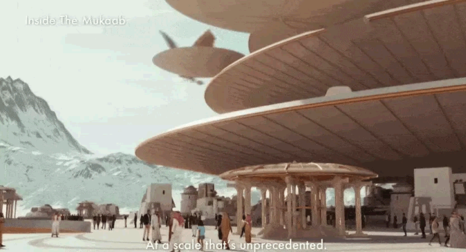 由無數(shù)個(gè)飛碟型樓層錯(cuò)落相疊而成的螺旋塔樓,是「The Mukaab」的心臟地帶。整個(gè)設(shè)計(jì)給人一種未來世界的感覺,讓人感受到驚奇和心跳。