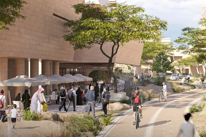 「New Murabba」社區(qū)里是一片流水潺潺、綠意盎然的景象。要知道沙特的森林覆蓋率一直維持在0.5%的水平,這是用鈔能力在缺水的沙漠中造了一個(gè)綠洲奇跡。
