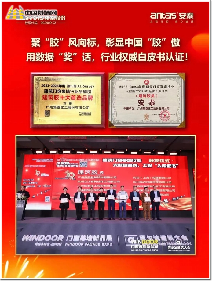 憑借強大的產(chǎn)品研發(fā)能力、突出的市場影響力、廣泛的用戶認可度,集泰股份第19次獲得“建筑膠十大首選品牌”的稱號,并入選了建筑門窗幕墻行業(yè)大數(shù)據(jù)“TOP10品牌”。連續(xù)多年蟬聯(lián),激勵我們要做得更多、更好、更用心。