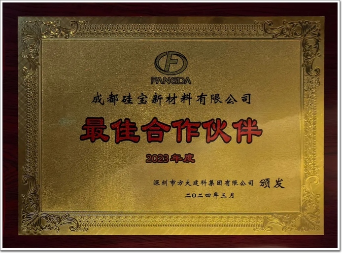 共5家企業獲此殊榮,硅寶科技是密封膠類的唯一一家。這是繼硅寶科技歷年榮獲方大建科“金牌合作伙伴”“優秀供應商”等無數榮譽之后,獲得的又一表彰,充分體現了方大建科對硅寶科技品質和服務的認可,也印證了“用好膠、選硅寶”的理念在客戶端得到認同!