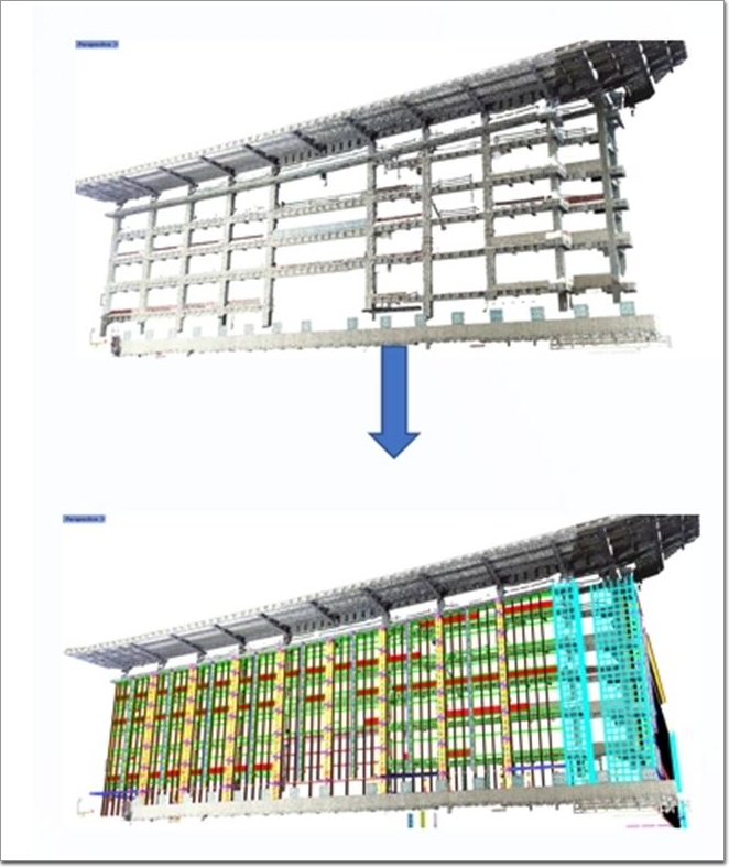 將三維掃描儀器與BIM技術結合,利用三維掃描得到的點云模型,經過參數(shù)化處理,對點云模型進行整合與簡化;通過逆向建模,將點云模型轉化為實體模型,把生成實體模型與根據(jù)施工圖建立的原理論模型進行對比,從而校核現(xiàn)場結構與理論結構之間的偏差。通過這種方式,提高現(xiàn)場施工安裝的準確性,提高現(xiàn)場安裝效率及質量安全。
