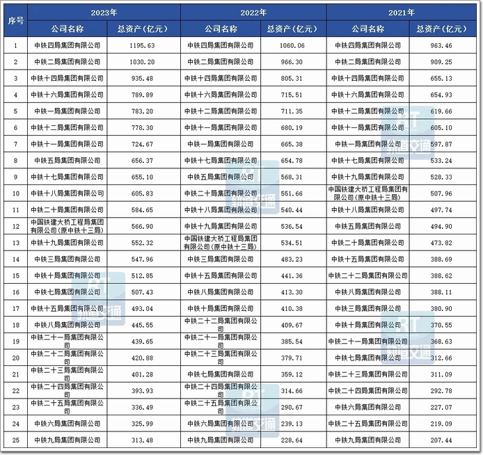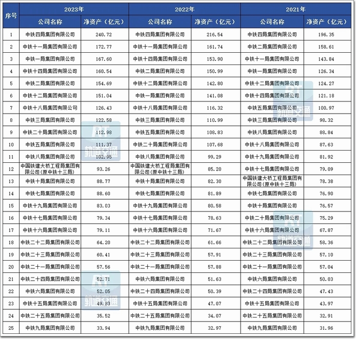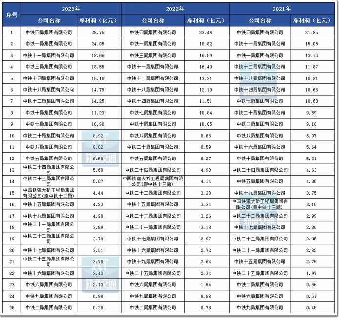 對比2021年、2023年,中鐵四局實力強悍,連續3年位居首位。