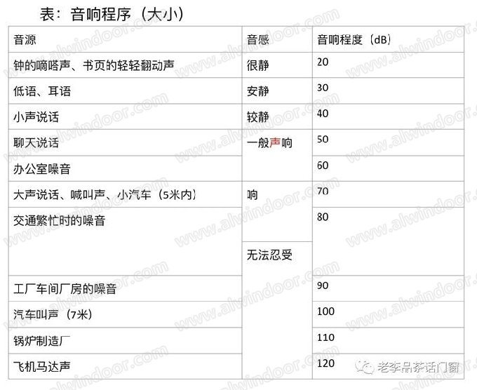 聲音的壓力決定著一個聲音的音響程序,隔音的單位分貝(dB)。為便于理解,從下表一些普通聲音中判斷其音響程度大小。