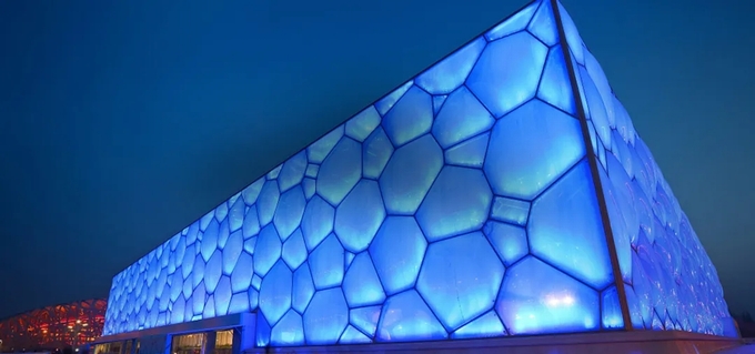 水立方是一座長寬177米乘177米,高31米的方型建筑,形狀看似隨意的建筑立面,但遵循著嚴格的幾何規則。水立方的幕墻由3800多個ETFE(四氟乙烯)氣枕組成,共有11種不同的形狀,內層和外層均安裝充有惰性氣體的枕頭。