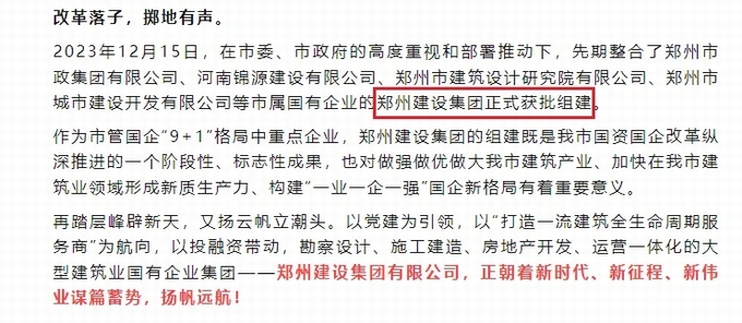 2024年初,鄭州市政府批復了成立“鄭州建設集團有限公司”,整合鄭州市政集團有限公司、河南錦源建設有限公司、鄭州市建筑設計研究院有限公司、鄭州市城市建設開發總公司等市屬國有企業。