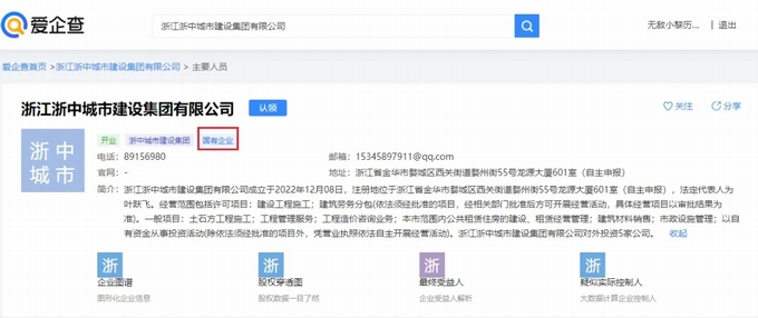 “愛企查”顯示:浙江浙中城市建設集團有限公司(國有企業)成立于2022年12月08日。注冊地位于浙江省金華市婺城區西關街道婺州街55號龍源大廈601室(自主申報),法定代表人為葉躍飛。