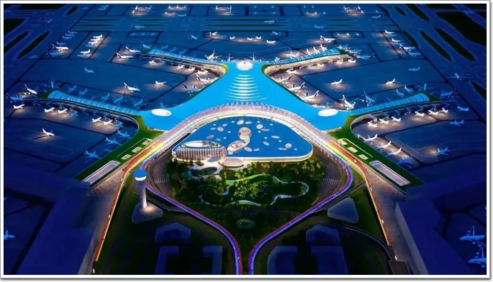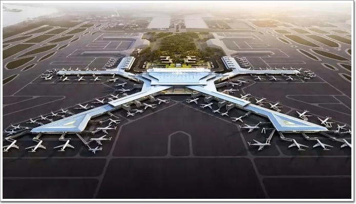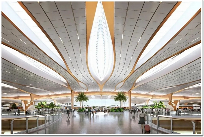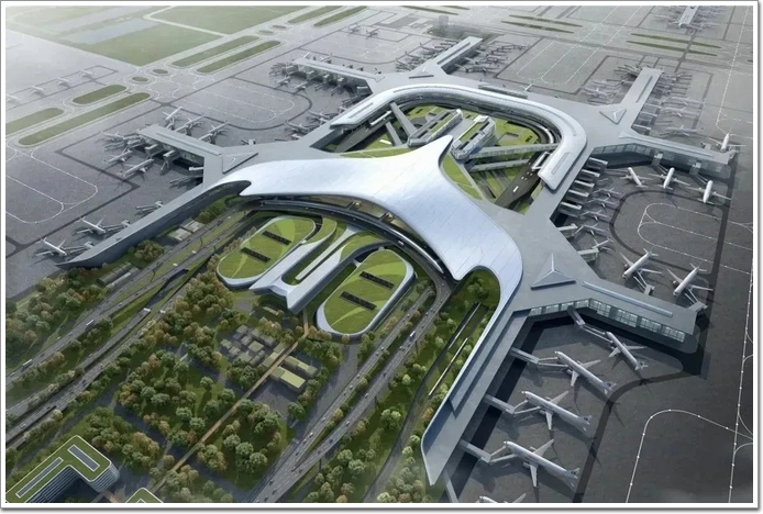 航站樓的建筑高度47.5米,主樓地上三層(局部帶夾層),地下三層,總投資約116億元。采用主樓+六指廊的直線構型,這樣可以最大限度增加近機位數量,縮短步行距離,提升旅客出行體驗。