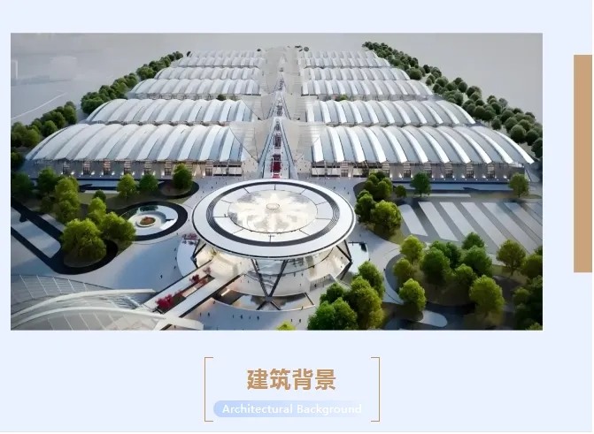展廳設計采用弧形鋼管+懸挑翼結構的屋面桁架結構、鉸接管柱+拉索結構的支撐立柱,形成了內部超大的“無柱空間”。