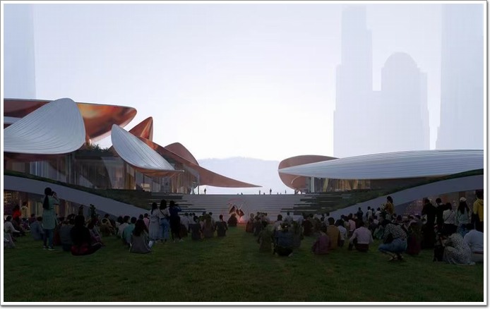 安吉"兩山"未來科技城文化藝術中心總建筑面積達11.89萬平方米,由12片形似竹葉的異形曲面結構金屬屋面形成層疊錯落自然建筑形態,白色金屬葉脈在陽光下閃爍著銀白色的光芒,與周圍綿延的茶田竹海交相輝映,完美詮釋了"建筑生于自然"的設計理念。