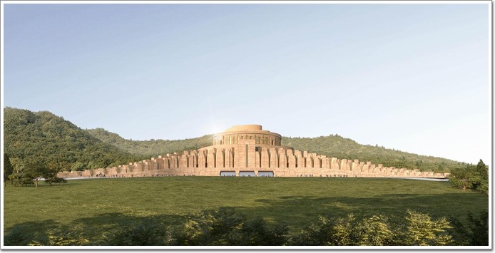在造型設計方面,項目主入口上方主造型以玉琮禮器元素為設計來源,突出入口的莊重感;主入口門洞支撐主石以“何尊”為元素導入,造型角端突出于器表,體側并有四道扉棱,造型渾厚,凸顯儀式感;在環(huán)廊門洞處,則延續(xù)了主石所蘊含的玉琮與玉璧文化元素,并巧妙融合山東古建筑的設計元素及其脈絡傳承,通過對文化元素與建筑元素的重新構思與呈現,塑造出別具一格的建筑風貌。