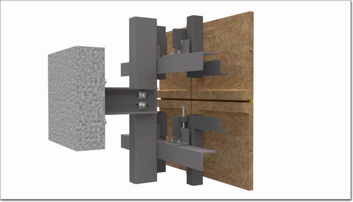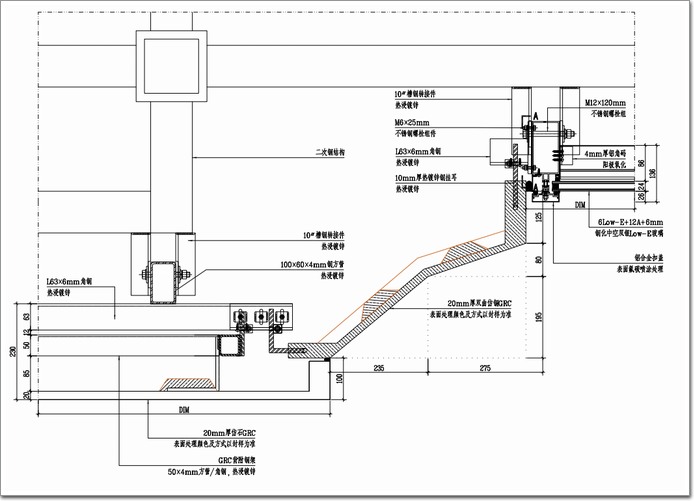 在GRC面板背面設置加強筋來提高面板的荷載承載力,GRC面板通過錨桿與背附鋼架連接成為一個整體,背附鋼架上設置掛耳,通過頂部掛耳上的調節(jié)螺栓實現高度方向的調節(jié),角鋼上設置長圓孔與橫梁通過螺栓固定,實現進出方向調節(jié),板塊在100mm角鋼上完成左右調節(jié)后通過自攻釘進行限位,最后GRC面板同背附鋼架整體掛接在短角鋼上,實現系統的整體掛接。