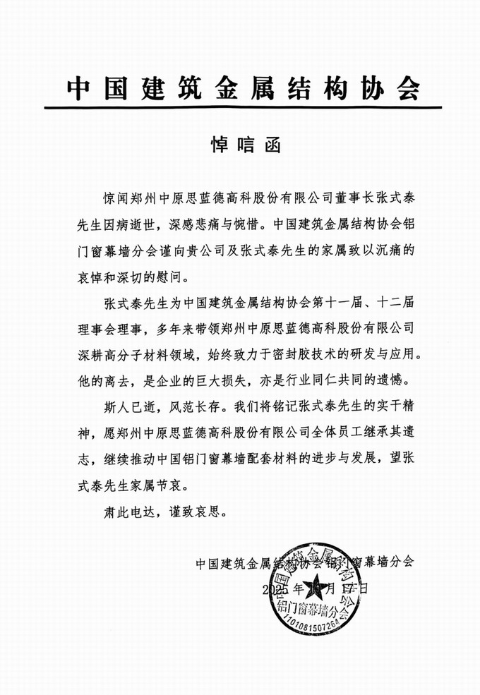 我們懷著沉重的心情告知各位,中國門窗幕墻行業知名企業家、中國建筑膠領軍品牌掌門人、鄭州中原思藍德高科股份有限公司董事長、株洲中原思藍德新材料科技有限公司董事長張式泰先生,因病醫治無效,于2025年10月17日下午14時20分在鄭州逝世,享年61歲。