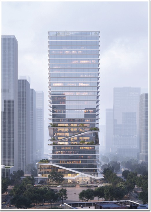 幾何立面通過一個由橫向水平遮陽板組成的標準幾何立方體外框,并向其內嵌入一個反弧玻璃幕墻體量,高效節能的通高玻璃幕墻將使用者與室外環境相連,水平方向的遮陽板同時增強了樓板的漫射采光深度,面向周邊社區的更為開放的露臺景觀。出色詮釋了一個集簡潔、優雅、高效為一體的、獨具字節文化屬性的辦公大樓。