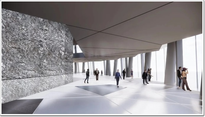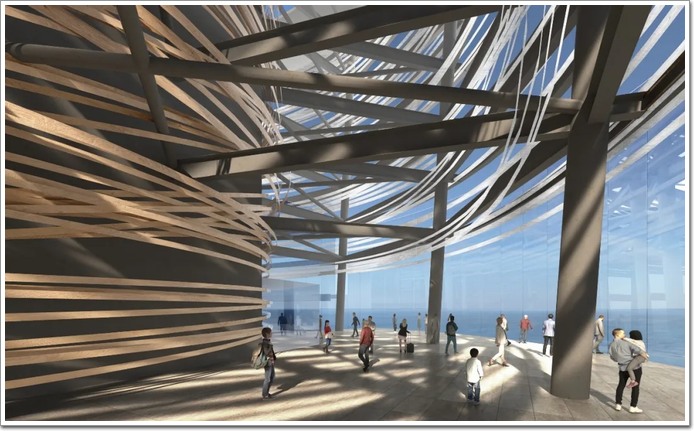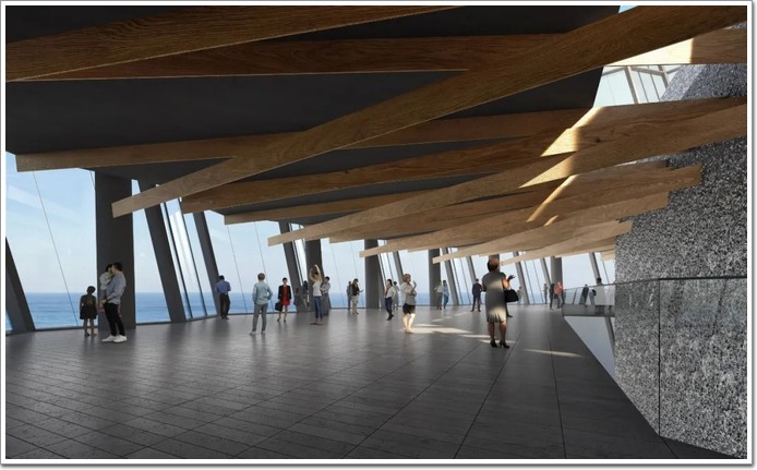 建筑基座設(shè)有大型開放平臺,與城市街區(qū)及濱海步道無縫銜接,形成連續(xù)的公共空間。下層為商業(yè)和城市服務(wù)空間,中部為辦公樓層與酒店客房,上部則為觀景層與餐飲區(qū)域。