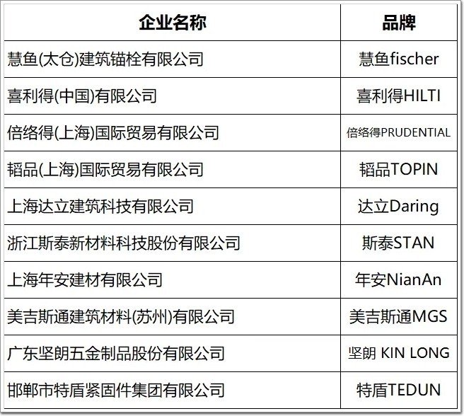 錨栓企業(品牌)|(10家提交數據參與展示):