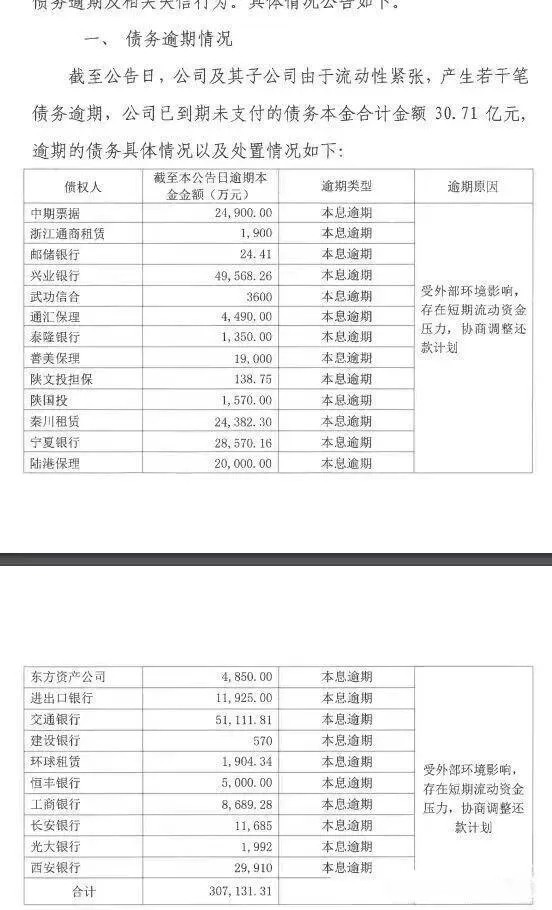 公司及其子公司由于流動性緊張,產(chǎn)生若干筆債務(wù)逾期,公司已到期未支付的債務(wù)本金合計金額30.71億元,逾期的債務(wù)具體情況以及處置情況如下: