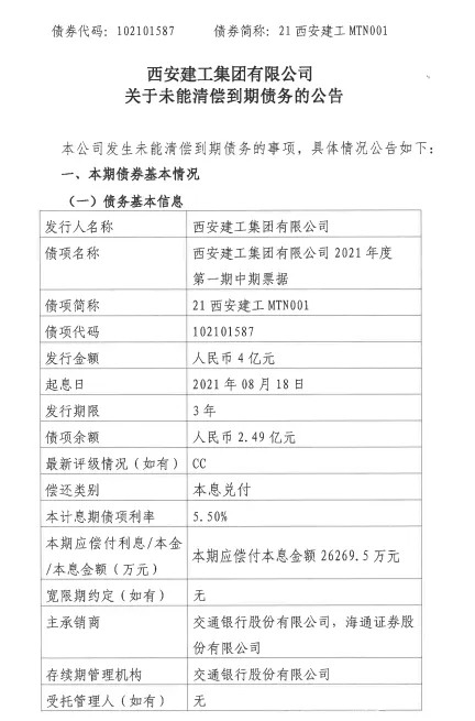 2024年8月19日,西安建工發(fā)布《西安建工集團有限公司關(guān)于未能清償?shù)狡趥鶆?wù)的公告》,稱西安建工未能于2024年8月19日完成“21西安建工MTN001”本息的兌付,截至2024年8月19日,西安建工未兌付本息合計為2.63億元。