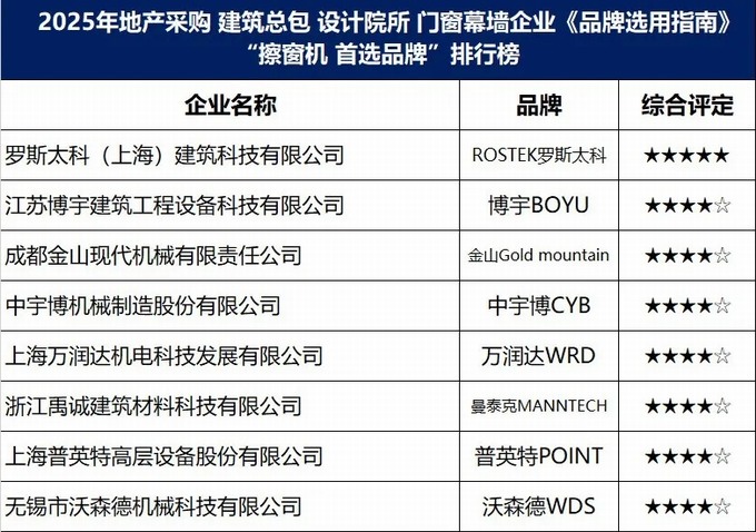以高品質(zhì)、用高質(zhì)量“擦”亮2025年度建筑市場中的“擦窗機”主流品牌推薦榜單。