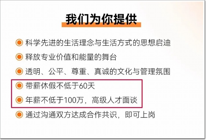 薪資待遇方面,帶薪休假不低于60天,年薪不低于100萬,通過溝通雙方達成合作共識,即可上崗。