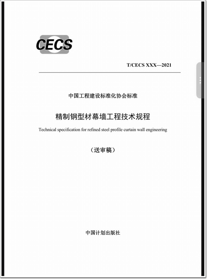 《精制鋼型材幕墻工程技術規程》由中國工程建設標準化協會于2020年立項(建標協字〔2020〕23號),適用于抗震設防烈度≤8度地區的工業與民用建筑幕墻工程。