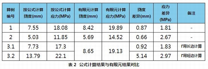 通過表2,可以看到算列01、算例02公式計算得出的撓度、應力與有限元分析得出的撓度、應力差異不大,而算例03中,有限元的結果與Γ用短邊邊計算得出的撓度、應力差較大,說明計算Γ時,L的選取不能一味的選用面板的短邊,而應根據面板的支撐情況,選用實際的傳力邊進行。
