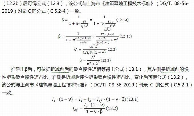 我們將SGP夾層玻璃面板簡化為組合效應的疊合梁,假定兩片厚度分別為t1、t2的梁通過其中間夾膠片組合起來,組合的效應通過剪力傳遞系數Γ來評估,Γ為1時,疊合梁變為完全組合梁,完全組合梁的慣性矩(詞條“慣性矩”由行業大百科提供)可以通過平行移軸公式進行推導。