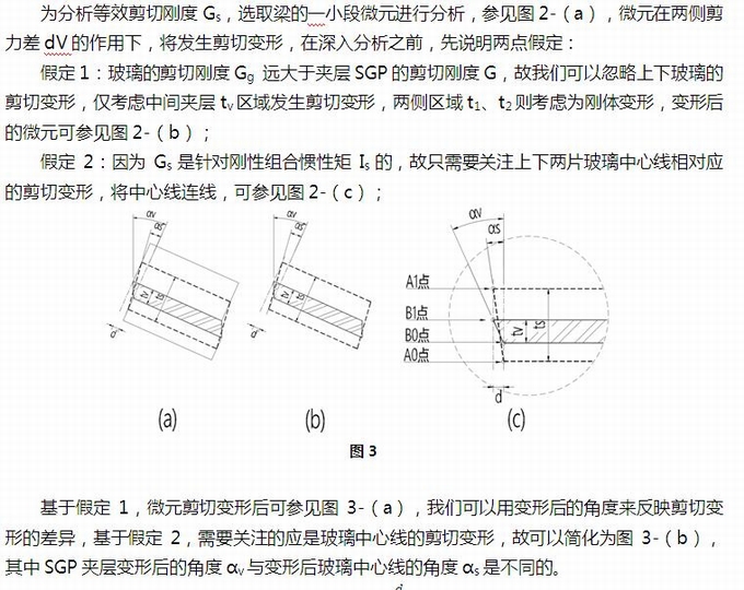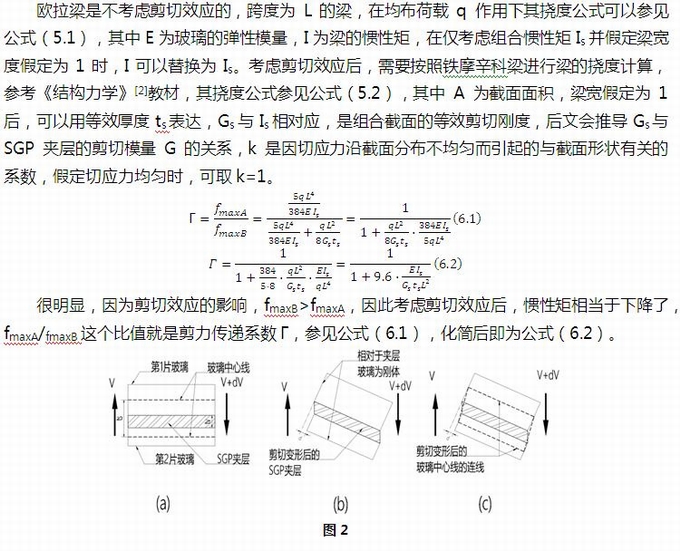 梁的剛度通過其撓度變化來評估,均布荷載作用下梁的撓度計算采用滿足歐拉-伯努利梁方程的歐拉梁即可,考慮夾膠層材料的剪切模量G比玻璃的剪切模量(詞條“模量”由行業大百科提供)Gg低很多,有必要考慮剪切效用對其剛度的影響,需按鐵摩辛科梁對其進行分析,通過對比鐵摩辛科梁與歐拉梁的撓度差異,得出剪力傳遞系數Γ。