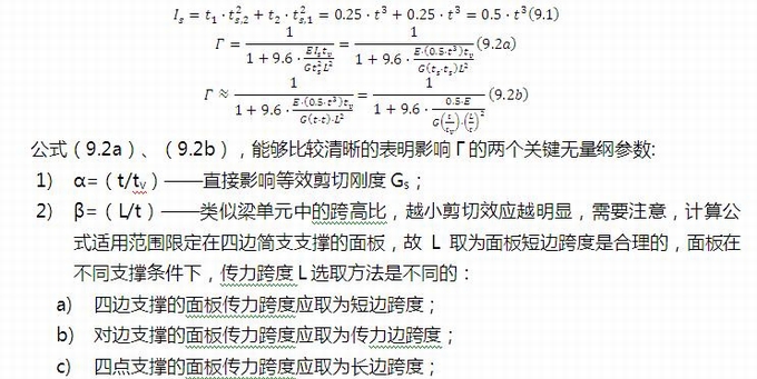通過3.1到3.2的詳細推導,公式可通過基于考慮剪切效應的簡支梁撓度計算公式進行推導得出,將其擴展到四邊簡支支撐的面板,其中關鍵的參數是夾層玻璃中間層膠片的剪力傳遞系數Γ,為進一步理解Γ,通過對等厚度SGP夾層玻璃的情況進行分析,先將此代入等效剛性組合慣性矩的公式,可得公式(9.1),再將其代入公式(8.1),并做變化,可得公式(9.2)。