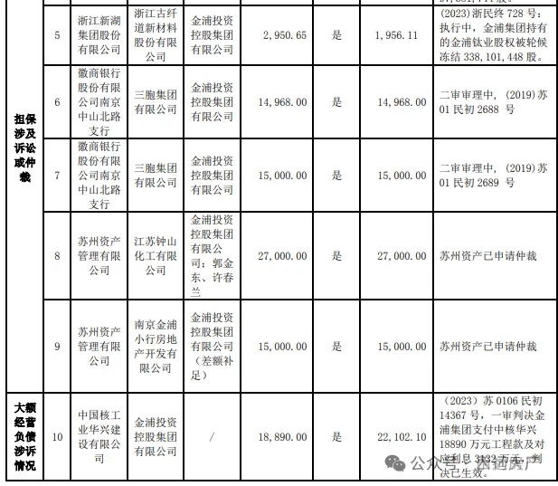 據金浦集團控股的金浦鈦業2024年半年報披露,最近一年大額債務逾期情況、違約記錄及因債務問題涉及的重大訴訟情況顯示,金浦集團合計涉訴金額13.716247億元,而金融負債逾期或違約涉及的金額7000萬元,擔保涉及訴訟或仲裁的逾期或違約涉及的金額8.99億元,大額經營負債涉訴逾期或違約涉及的金額1.889億元,也就是說金浦集團拖欠法院判決生效的逾期或違約金額已高達11.579億元。
