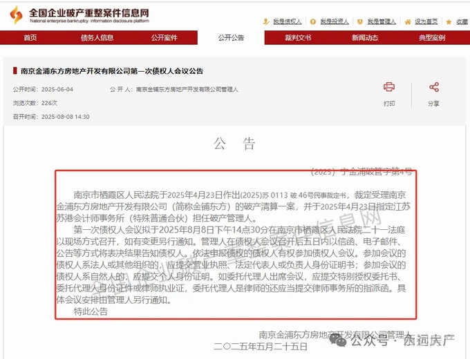 近期,南京市棲霞區人民法院作出決定,裁定受理南京金浦東方房地產開發有限公司的破產清算一案,并于2025年4月23日指定江蘇蘇港會計師事務所(特殊普通合伙)擔任破產管理人。