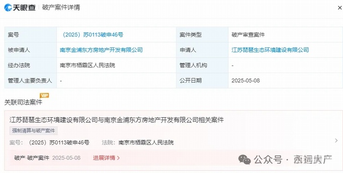 天眼查顯示,本次破產案件由江蘇琵琶生態環境建設有限公司申請。該公司與南京金浦東方房地產開發有限公司因建設工程施工合同糾紛對簿公堂。