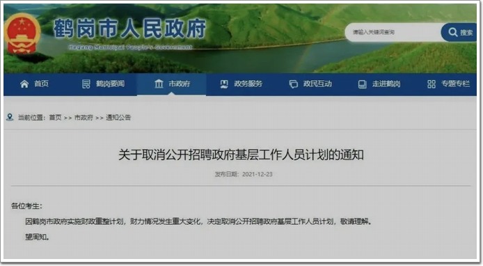 據(jù)鶴崗市人民政府網(wǎng)站,2021年12月23日,鶴崗市人力資源和社會(huì)保障局發(fā)布《關(guān)于取消公開招聘政府基層工作人員計(jì)劃的通知》,原因是,“因鶴崗市政府實(shí)施財(cái)政重整計(jì)劃,財(cái)力情況發(fā)生重大變化”,人員招聘工作無(wú)法正常開展了。