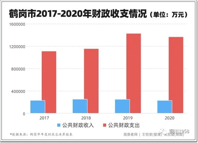 2018年、2019年、2020年,鶴崗全市公共財(cái)政收入分別為25.2億元、24.9億元、23億元,而公共財(cái)政支出卻分別達(dá)到115.7億元、143億元和136.8億元。
