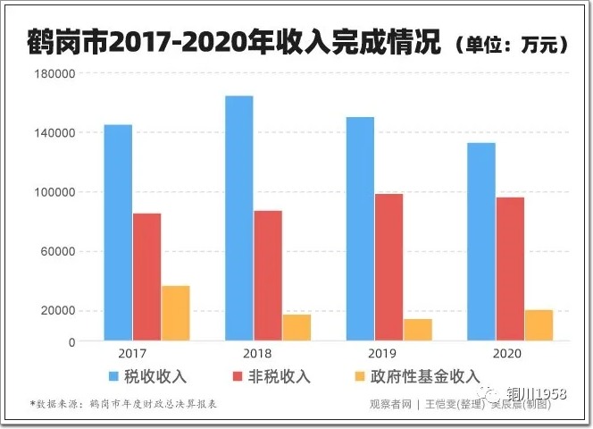 《鶴崗市2020年決算分析報(bào)告》顯示,2020年全市公共財(cái)政收入完成23億元,同比下降7.8%,完成年預(yù)算的89.4%。2020年鶴崗全市稅收收入完成13.3億元,完成年預(yù)算的83.2%,減收1.73億元,同比下降11.5%。