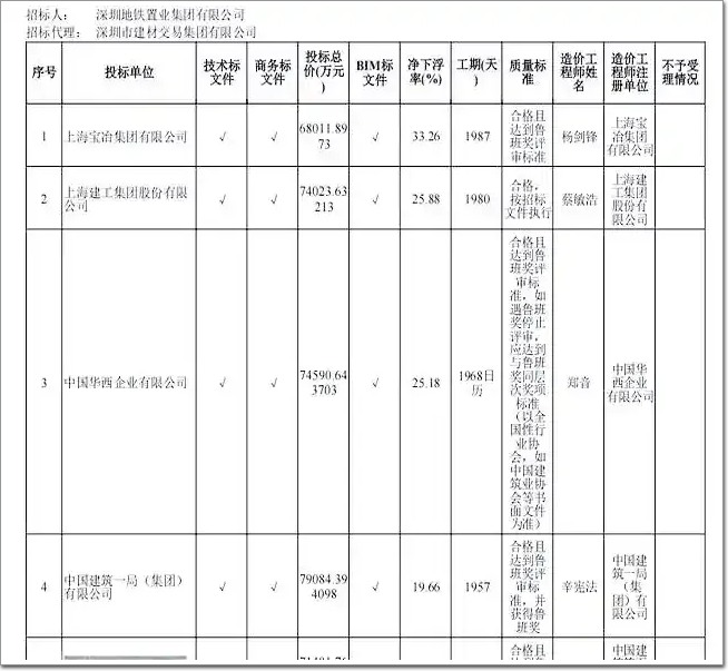 該項目的招標控制價高達95092.8萬元,而上海寶冶的最終報價卻令人矚目地比控制價低了33.26%中標。這一比例遠超排名第二的中建五局,更是比中建一局的次高價低了13.6%。
