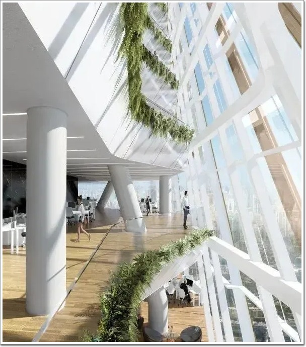 為與建筑功能相契合,大廈內部設置貫通各樓層的中庭(詞條“中庭”由行業大百科提供)空間,既促進人員交流互動,又融入綠植景觀,改善室內空氣質量與空間舒適度;屋頂花園還為各類活動舉辦與休閑休憩提供了額外空間。