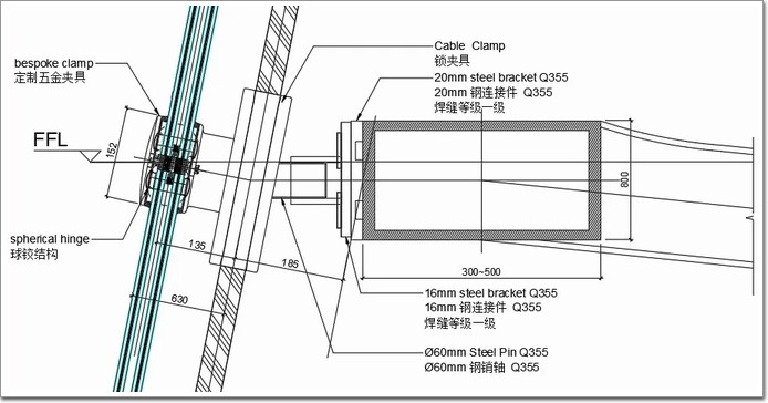 項目在6層與8層設置兩道橫向精致鋼梁,結合堅朗Ø42不銹鋼拉索,有效減少單索體系跨度,優化拉索直徑。拉索節點經過特殊設計,索頭與底座均隱藏于結構中,在實現整潔立面的同時,預留張拉孔便于施工與后期維護,體現“隱藏式力量”的設計智慧。