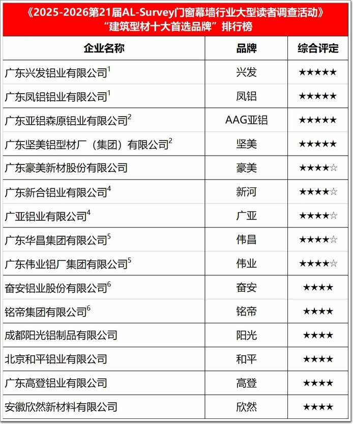“建筑型材首選品牌”年度榜單⇧