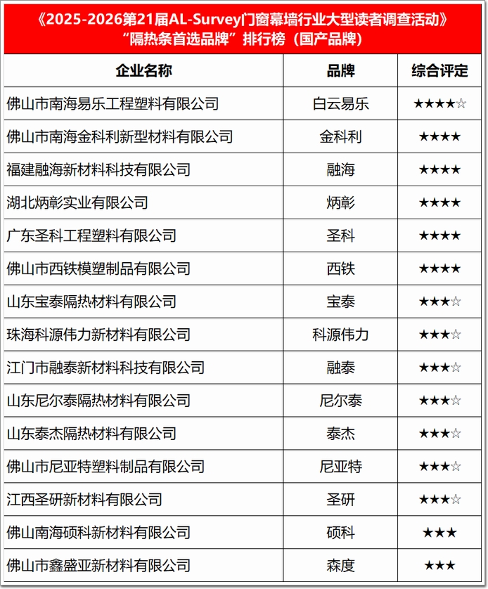 “隔熱條首選品牌”年度榜單(國產)⇧