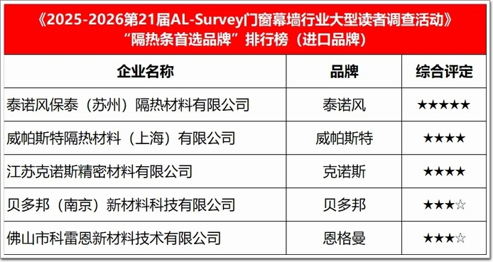 “隔熱條首選品牌”年度榜單(進口)⇧