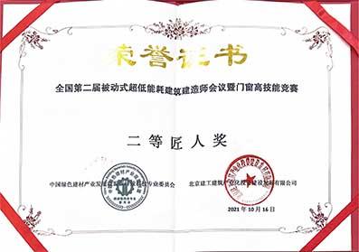 全國第二屆被動式超低能耗建筑建造師會議暨門窗高技能競賽二等匠人獎 |