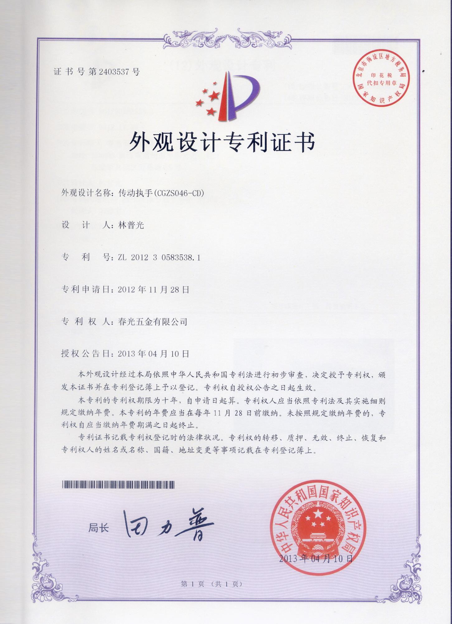 傳動執(zhí)手CGZS046-CD外觀設(shè)計(jì)專利證書 |