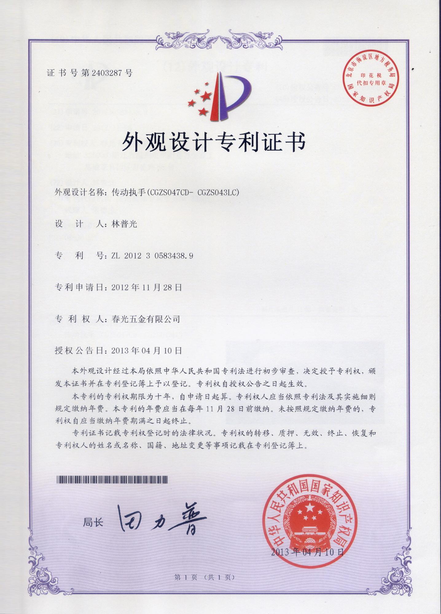 傳動執(zhí)手CGZS041-LC外觀設(shè)計(jì)專利證書 |
