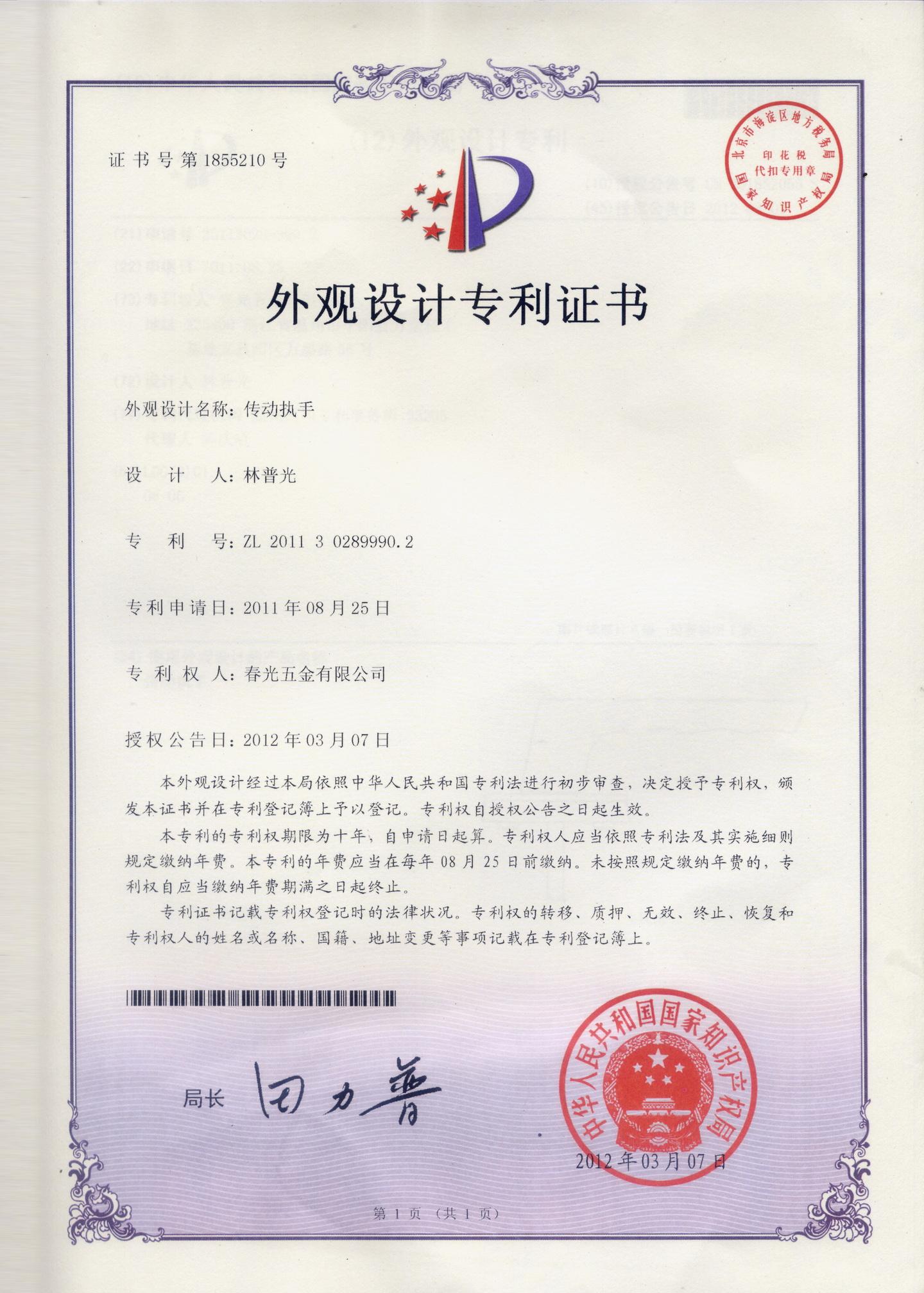 傳動執(zhí)手外觀設(shè)計(jì)專利證書 |